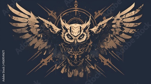 Fototapeta premium A stylized owl illustration with wings spread, featuring intricate designs and a mystical aura.