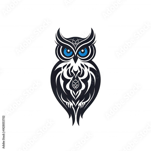 © Kamonwan, Obraz premium A stylized owl with striking blue eyes, featuring intricate designs and a bold silhouette, on a white isolated background.