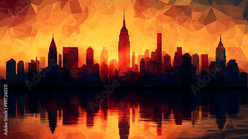 © Paul, Obraz premium A stylized silhouette of your city's skyline at sunset, blending iconic buildings with abstract geometric shapes, digital illustration,warm hues,minimalistic,local pride