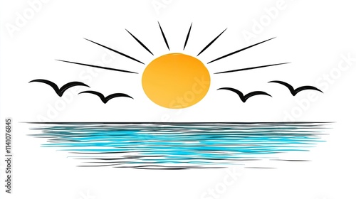 Obraz premium A stylized sunset over the ocean with birds flying, evoking tranquility and...