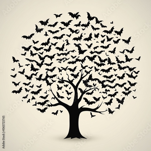 © MetaKibo, Obraz premium A stylized tree filled with flying bats, creating a unique graphic design.