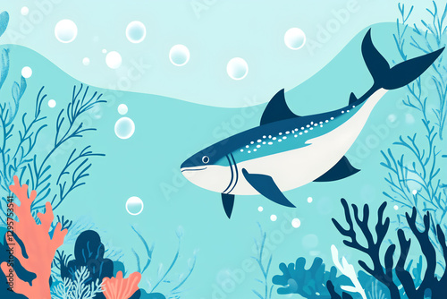 Obraz premium A stylized underwater scene featuring a sleek bluefin tuna (Thunnus thynnus) swimming among coral and bubbles.