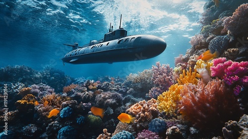 © Titik, Fototapeta premium A submarine exploring vibrant coral reefs underwater.