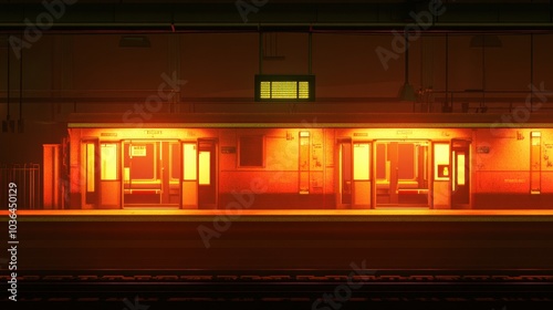 © 69, Fototapeta premium A subway train with open doors, illuminated by warm lights in a dark, empty station, creating a quiet yet inviting nighttime scene.
