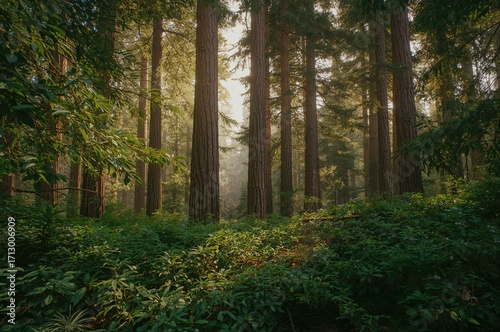 © TheWaterMeloonProjec, Obraz premium A summer woodland backdrop featuring pine trees, nature, and sunlight filtering through leaves