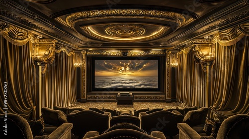 © Adnan saheem, Fototapeta premium A sumptuous home theater with velvet seating, gold trimmings, and a massive screen framed by thick, luxurious drapes Ambient lighting sets the mood