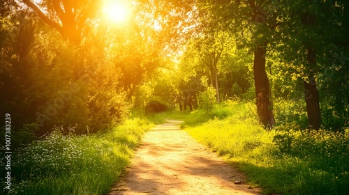 Fototapeta premium A sun dappled forest lined with vibrant green