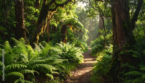 Obraz premium A sun-dappled forest path winding through lush green ferns and towering...