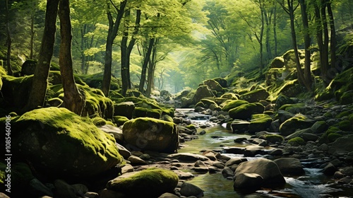 Obraz premium A sun-dappled forest with mossy boulders and vibrant green vegetation