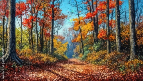 © Ida, Fototapeta premium A Sun-Dappled Path Through a Stylized Forest of Crimson and Gold
