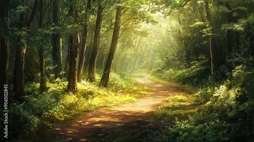 Fototapeta premium A sun-dappled path winds through a lush forest, sunlight filtering through...