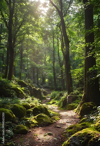 Obraz premium a sun-dappled path winds through a lush, moss-covered forest, creating a serene and enchanting woodland scene.