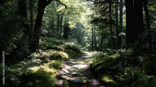 Fototapeta premium A sun-dappled woodland path winds through lush greenery, illuminating mossy...