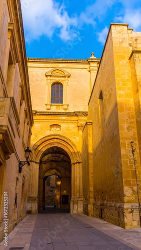 © Warda, Fototapeta premium A sun-drenched alleyway leads past a historic yellow stone building, showcasing intricate arches and architectural details under a vibrant blue sky.
