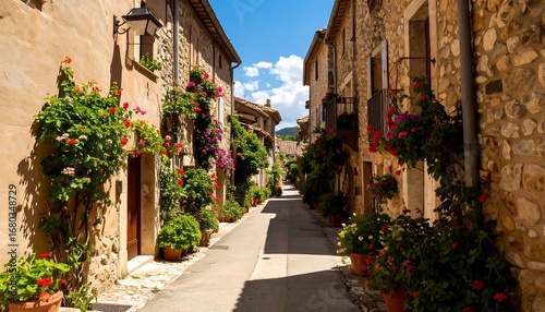 © enative, Fototapeta premium A sun-drenched alleyway lined with colorful flowers and stone buildings. A picturesque village scene