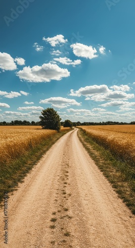 © Ariestia, Naklejka premium A sun-drenched country lane meanders through golden fields under a vast expanse of fluffy white clouds against a vibrant blue sky.