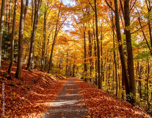 © Tengok, Obraz premium A sun-drenched forest path winds through a vibrant autumn landscape, displaying a carpet of fallen leaves in warm hues of orange and red.