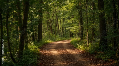 Naklejka premium A sun-drenched woodland path winds through a dense forest, dappled with light...
