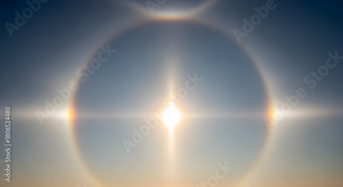© Eitu Project, Fototapeta premium A sun halo appears in a clear blue sky featuring a bright circular ring around the sun and a smaller arc above it