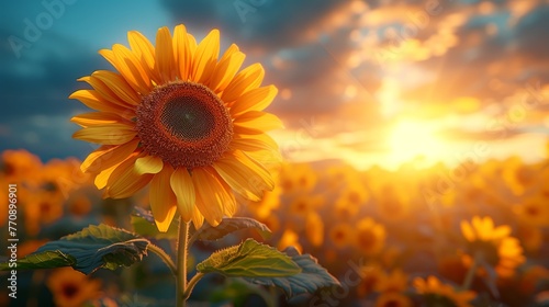 Fototapeta premium A sunflower amongst sunflowers, blue sky overhead, foreground clouds