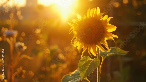 © Suphakorn, Naklejka premium A sunflower field bathed in warm sunlight