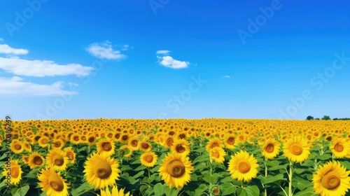 Fototapeta premium A sunflower field stretching to the horizon under a clear blue sky.