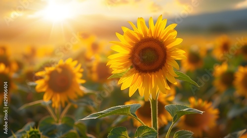 Fototapeta premium A sunflower field under the setting sun, with sunlight casting long shadows over vibrant yellow petals and green leaves.