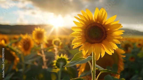 © horizon, Fototapeta premium A sunflower field under the setting sun, with sunlight casting long shadows over vibrant yellow petals and green leaves.