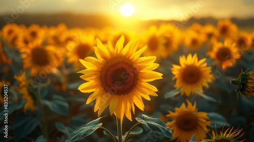 © LUPACO IMAGES, Obraz premium a sunflower in a field with the sun setting in the background