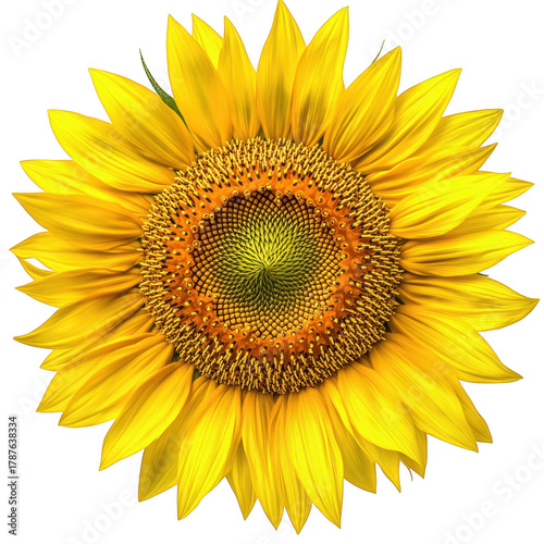 © PERFECTisME, Fototapeta premium A sunflower in full bloom. its bright yellow petals and intricate seed pattern at the center. set against a soft white background. perfect for nature-themed projects