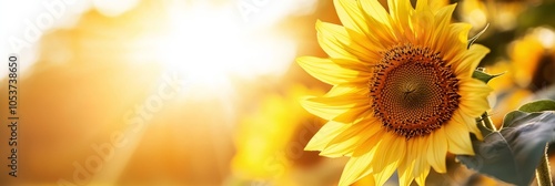 Fototapeta premium A sunflower, towering in a field, with sunlight filtering through its leaves, and directly illuminating it