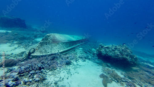 Fototapeta premium A sunken boat underwater. An upside down boat on the seabed among the corals.