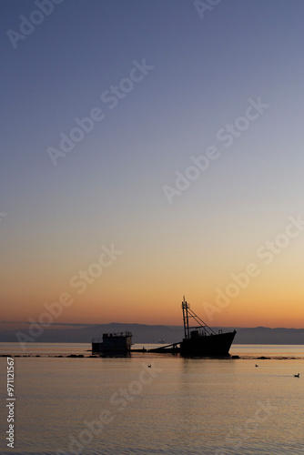 Fototapeta premium a sunken ship on a beach at sunset in Chile