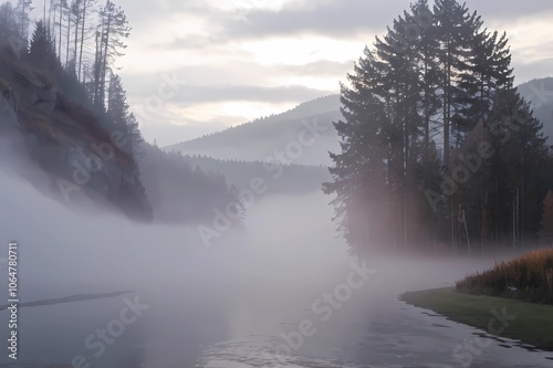 © viya chi, Fototapeta premium A sunlight foggy scene with nature in the background