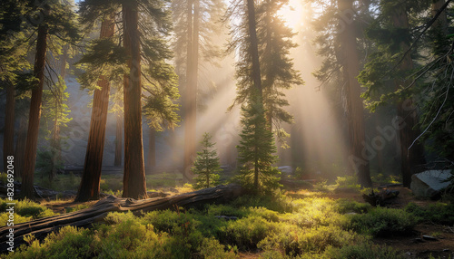 Fototapeta premium A sunlight streaming through trees, San Bernardino National Forest