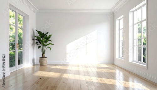 Fototapeta premium A sunlit, empty room with large windows and a potted plant, showcasing a bright and airy ambiance.
