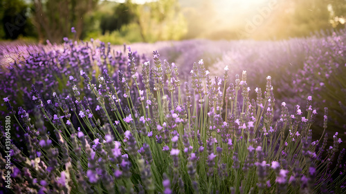 Naklejka premium A sunlit field of lavender with the flowers swaying in the warm breeze.