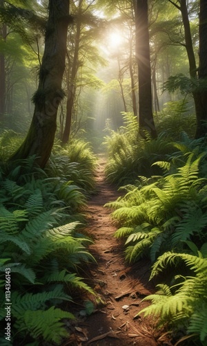 Fototapeta premium A sunlit forest floor is carpeted in ferns and other leafy greens with dappled sunlight filtering through the trees, leafy greens, natural scenery, sunlight filtering