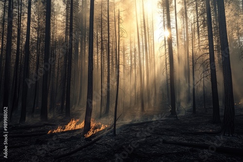 © MrHamster, Obraz premium A Sunlit Forest Floor with Burning Embers and Smoke