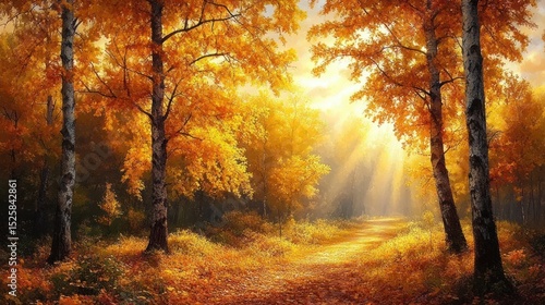 Fototapeta premium A sunlit forest path surrounded by tall trees with golden autumn leaves, warm...