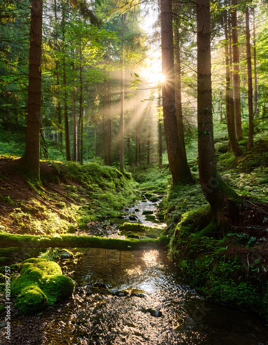 © homydesign, Obraz premium A sunlit forest path winds along a tranquil stream