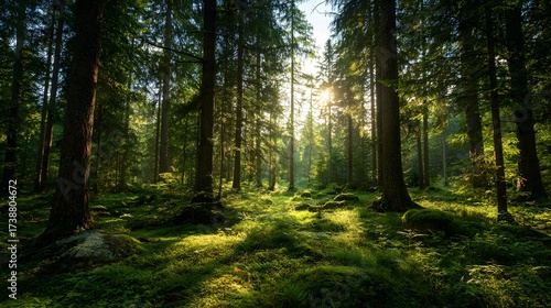 Obraz premium A sunlit forest scene showcases the lush green undergrowth and towering trees, creating a tranquil and inviting natural environment, the golden sun rays penetrate the foliage