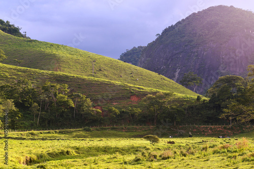 © sauloangelo, Fototapeta premium A sunlit pasture with grazing cattle, casting a warm, golden glow over the tranquil countryside landscape.