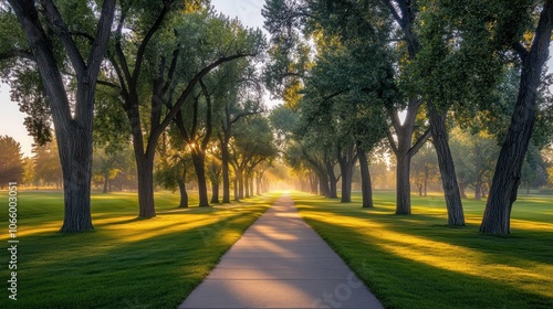Obraz premium A sunlit path runs through a tree-lined walkway with grassy fields on either...