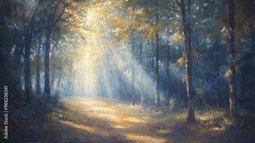© Koplexs-Stock, Obraz premium A Sunlit Path Through a Dense Forest