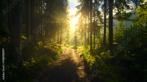 Naklejka premium A sunlit path through a forest of tall pine trees, leading to a scenic...