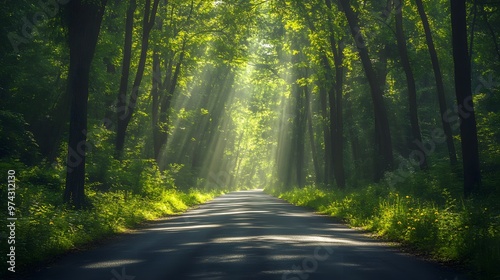 © Hesti, Fototapeta premium A sunlit path through a green forest, with sunlight filtering through the trees.