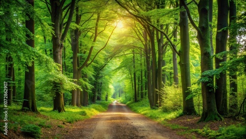 Obraz premium A sunlit path through a lush canopy of trees, dappled light filtering through the leaves, creating a magical atmosphere