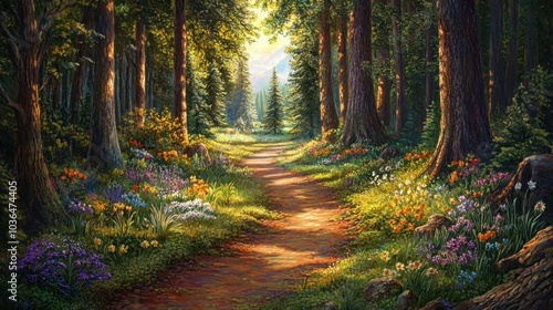 Fototapeta premium A sunlit path through a lush forest, with wildflowers blooming on either...