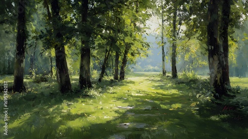 Fototapeta premium A sunlit path through a verdant woodland, dappled with sunlight and shadow,...